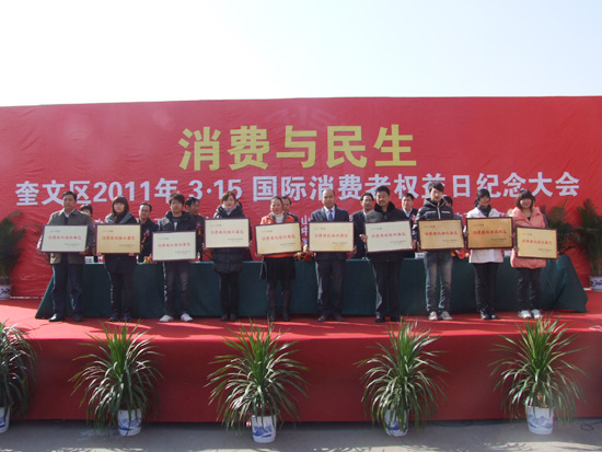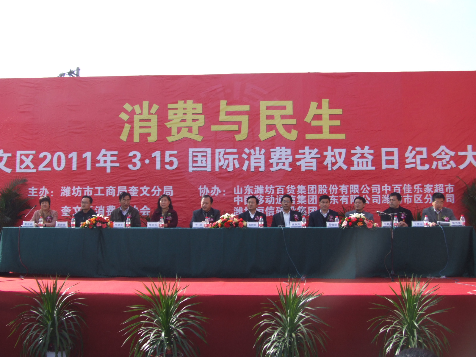 2011年3月15日,由潍坊市工商局,潍坊市消费者协会联合主办3.15国际消费者权益日纪念大会暨“消费与民生”活动,在我市新华路佳乐家广场拉开序幕。潍坊市奎文区副书记副区长高东祥 高殿臣等区领导及区工商局局长王致奎出席活动,并作专题发言。并对2010年度潍坊市“消费与维权”先进标兵单位给予肯定和表彰。方圆网通总经理张夕善应邀参加活动,并上台领奖。 “消费与民生”活动现场