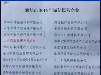 近日,潍坊市2016年度诚信民营企业评选活动隆重揭晓。潍坊方圆网通科技有限公司在全市数万家企业中脱颖而出,被授予“潍坊市诚信民营企业”荣誉称号。