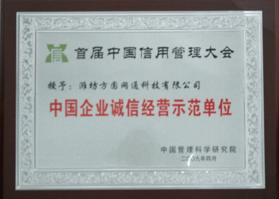 诚信,是潍坊方圆网通有限公司多年来一直坚守的经营原则,更是企业的生命,让方圆网通多年来得以持续发展。“诚信赢天下”——方圆网通凭借在互联网行业多年的诚信经营,多次为自己赢得了“中国企业诚信经营示范单位”的荣誉称号,在互联网行业充分发挥诚实守信企业的模范带头作用。
